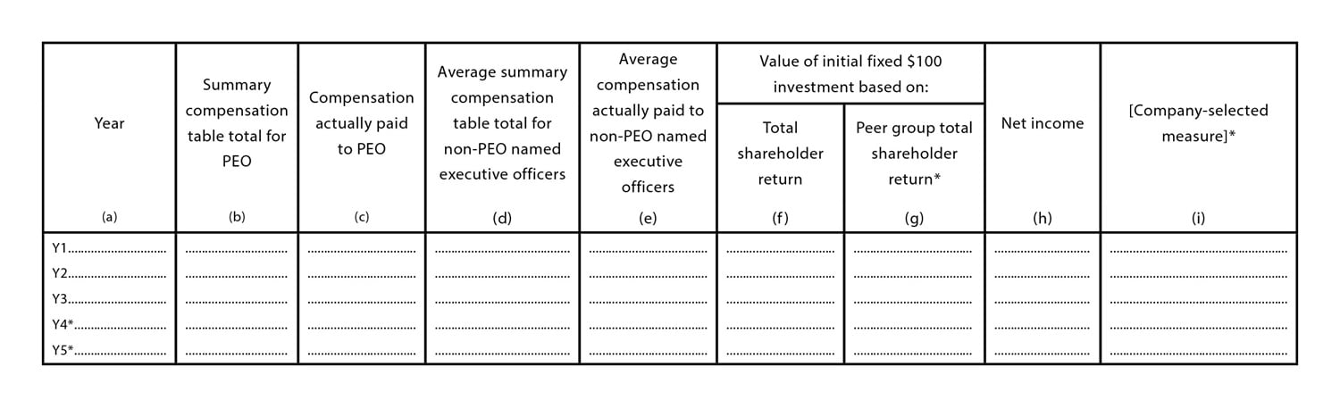 Item 402(v) requires the following pay-versus-performance disclosure table, with the asterisked items indicating portions of the table from which SRCs are exempt: