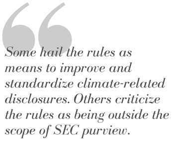 Some hail the rules as means to improve and standardize climate-related disclosures. Others criticize the rules as being outside the scope of SEC purview.